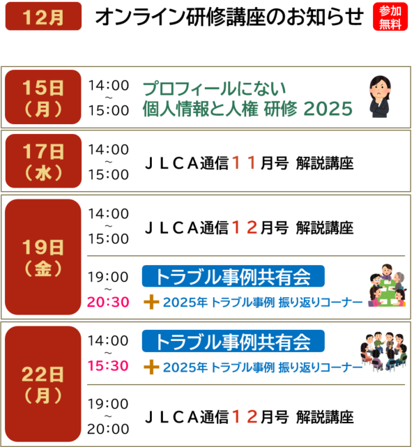 そして!今月もJLCA通信12月号に掲載しきれない、様々な事例や解説、データをオンライン解説講座でお届け予定です!